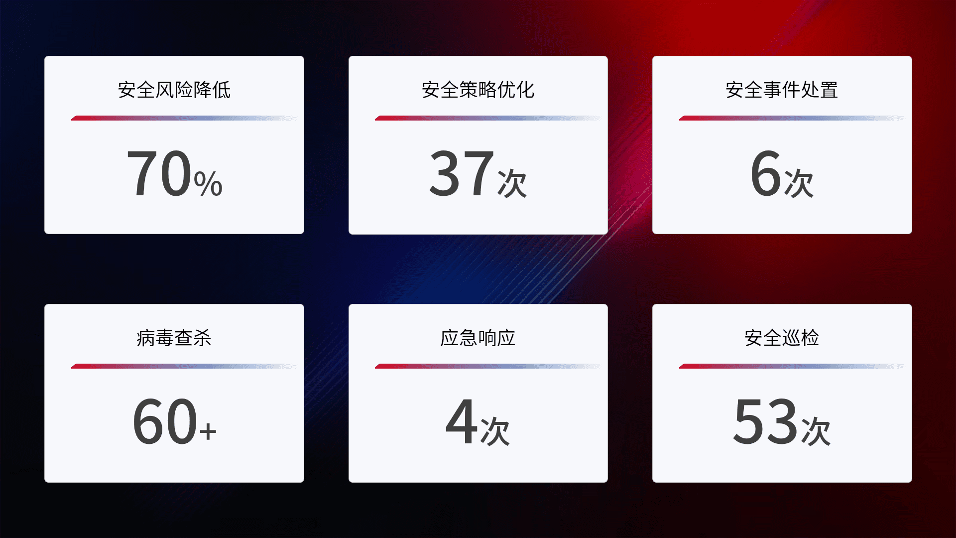 提供全面的安全事件报告体系,,包括处置报告、、、周报、、、季度和年度总结,,,结合持续监控,,,帮助客户深入了解网络安全状况。。。。